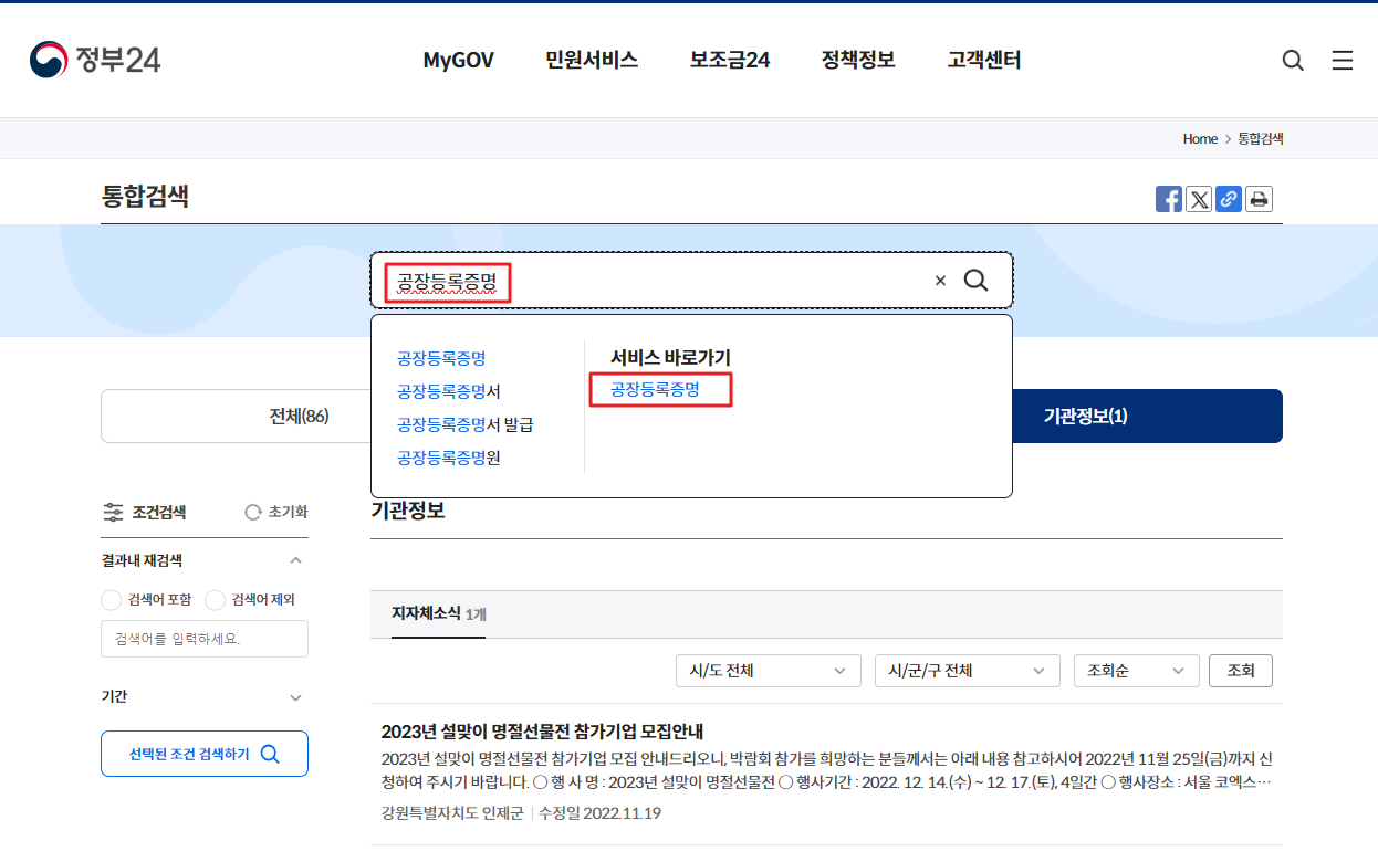 정부 24 홈페이지의 검색창에 공장등록증명을 적어줍니다.