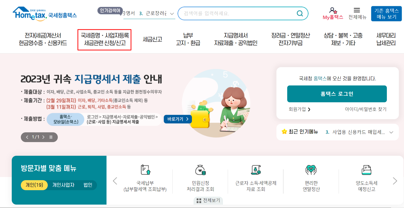 홈택스 사이트에서 아래 국세증명,사업자등록 세금관련 신청/신고에 커서를 댑니다.