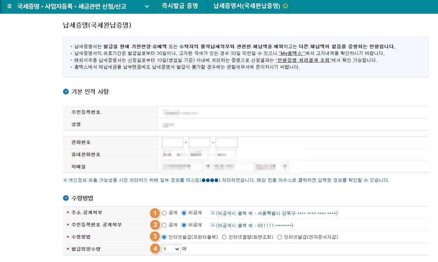 주소공개여부, 주민등록번호 공개여부, 수령방법은 인터넷발급(프린터출력)을 선택하여