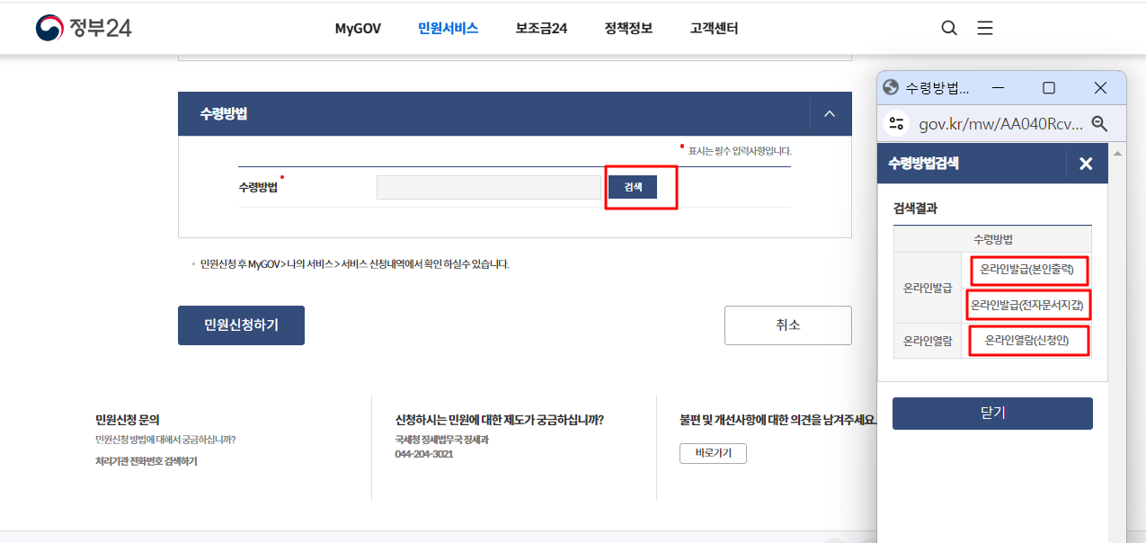 수령방법을 검색하면