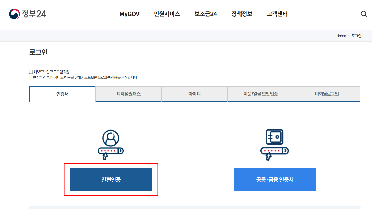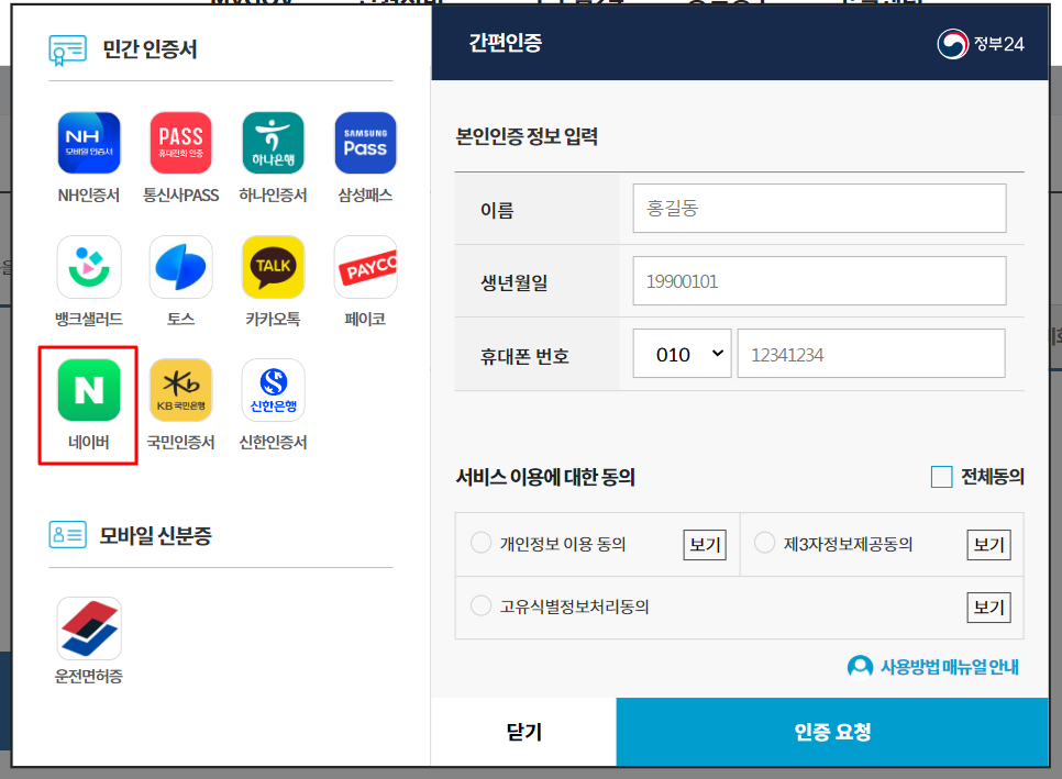 민간인증서 중에서 네이버로 간편인증을 하였습니다.