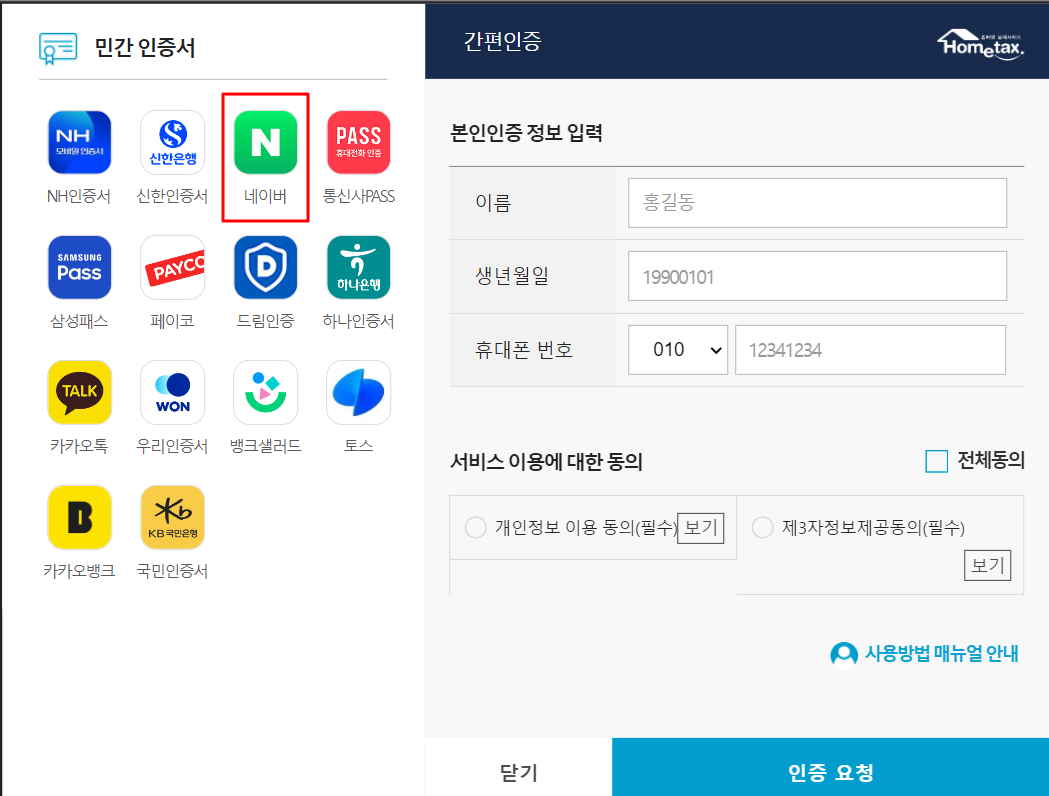민간인증서 중에서 저는 네이버를 선택하여 본인인증 정보를 입력후 핸드폰으로 온 네이버 인증을 하였습니다.