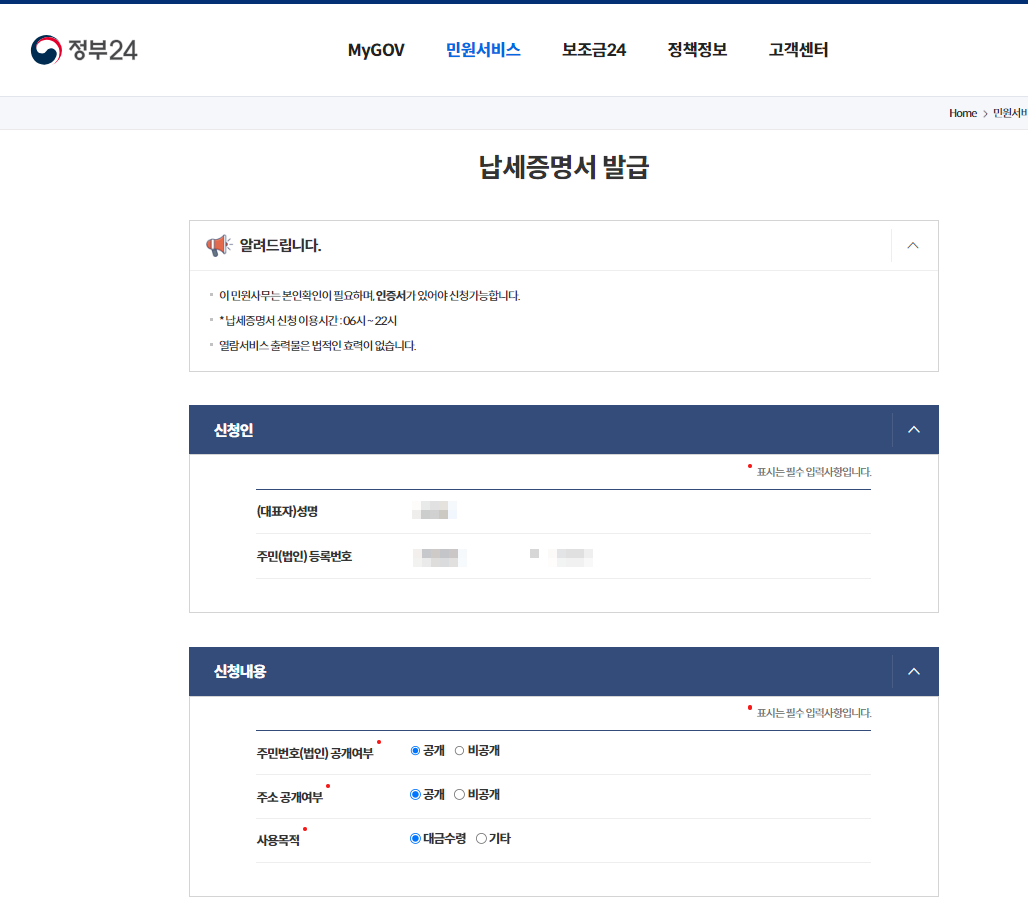 인증요청후 납세 증명서 발급 페이지가 나옵니다.