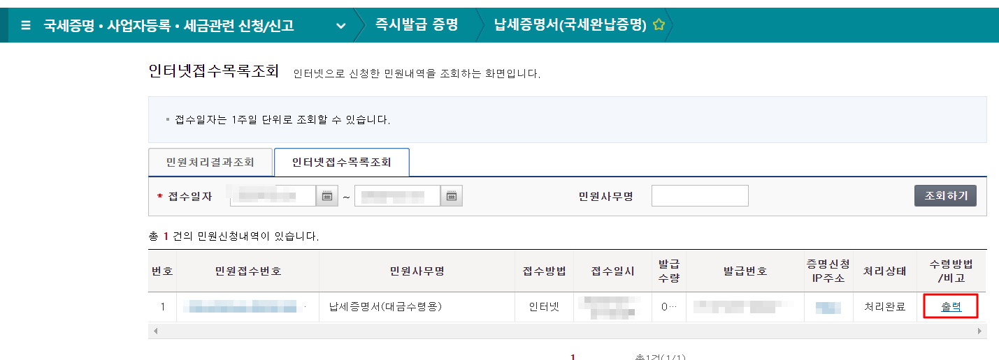 국세완납증명서는 인터넷으로 무료 발급 가능합니다.