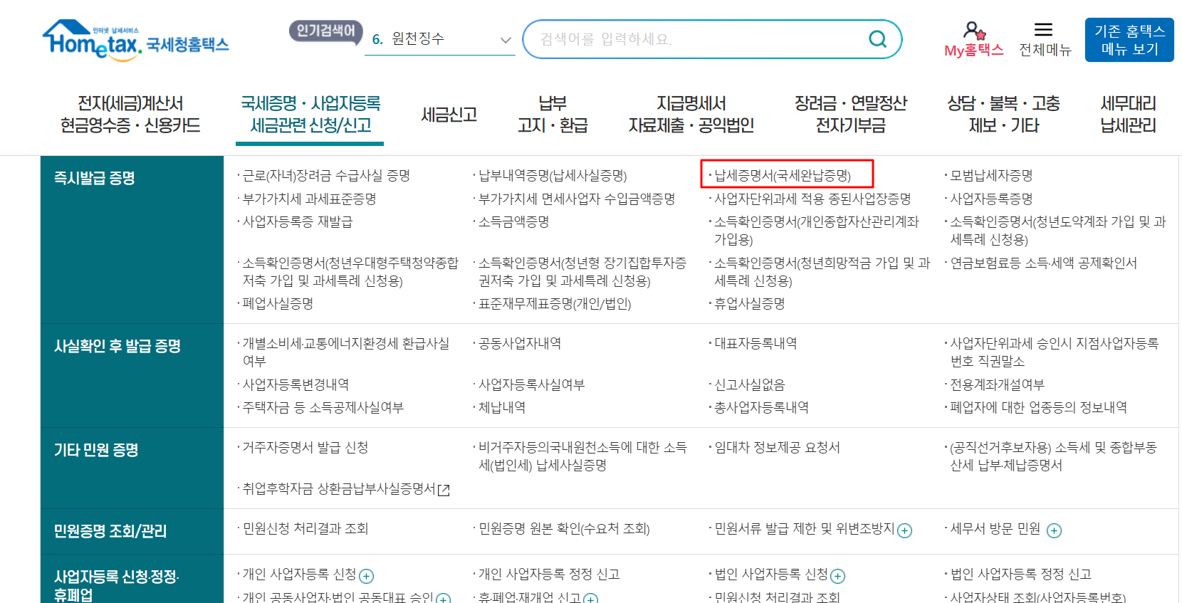 아래와 같이 검색창에 국세완납증명서라고 작성하면