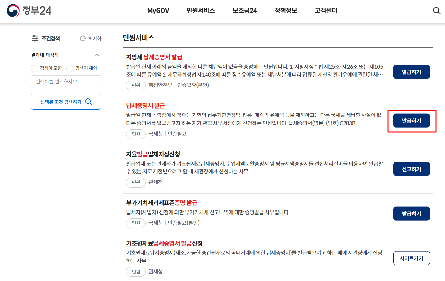 그 중에서 납세증명서 발급하기를 클릭합니다.