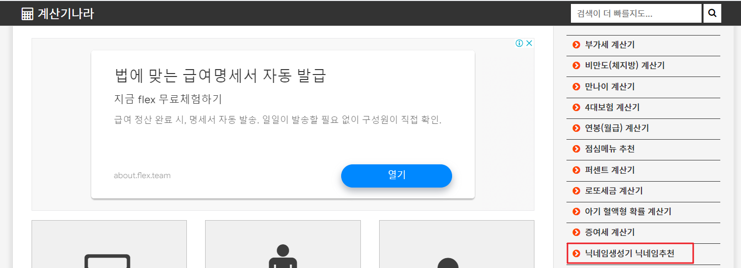 계산기 나라 사이트에서 오른쪽 아래의 닉네임 생성기 닉네임추천을 클릭합니다.
