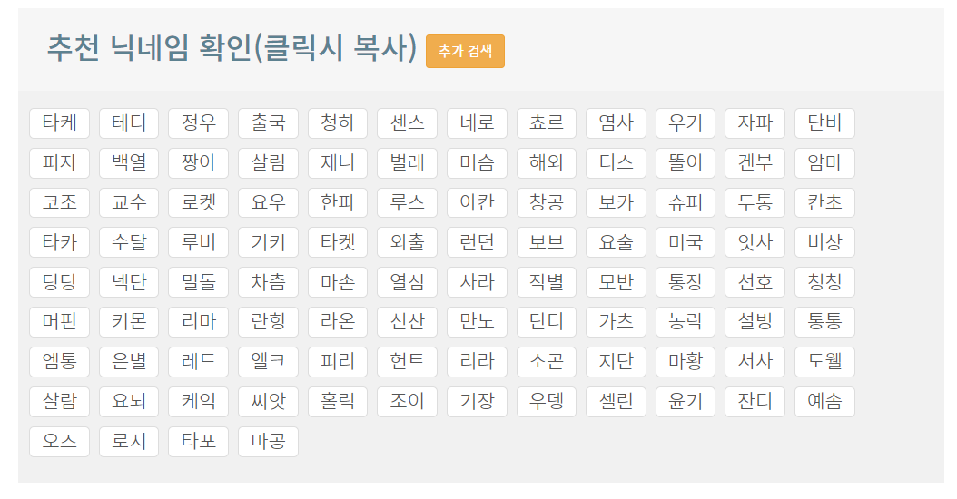 아래 부분에 바로 랜덤 닉네임 생성결과가 나옵니다.