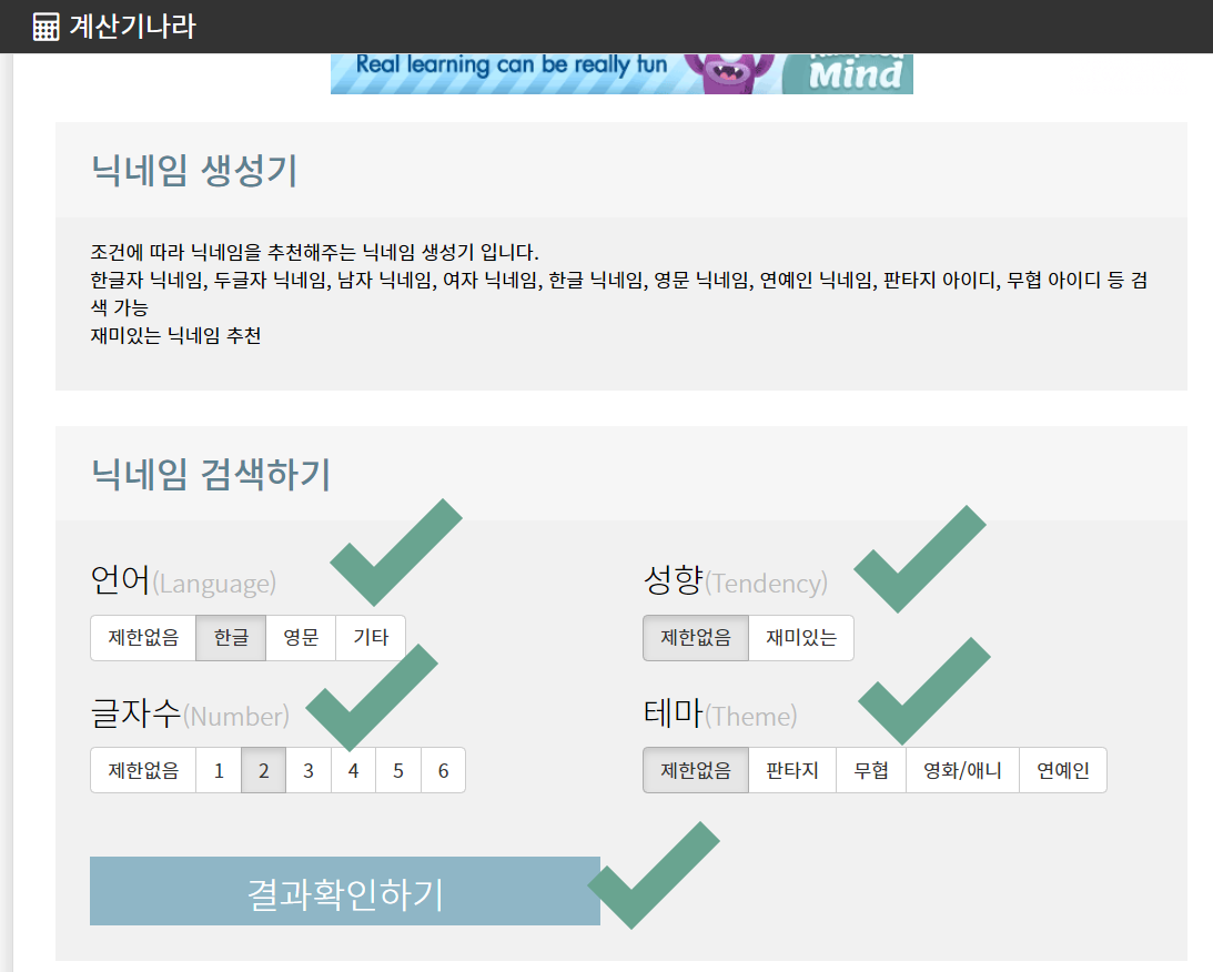 두번째로 두글자 닉네임 생성기는 계산기나라입니다.