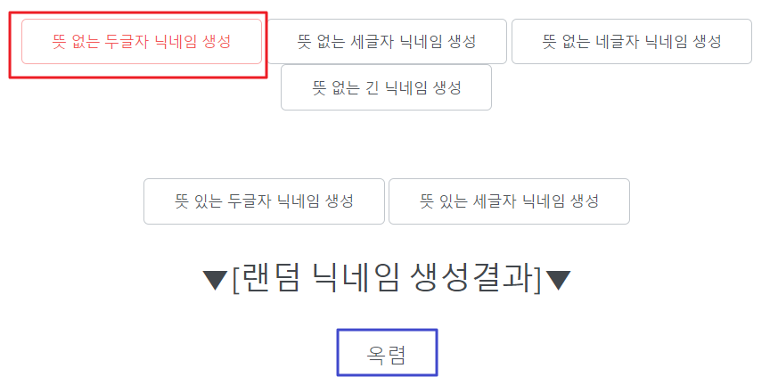 뜻없는 두글자 닉네임 생성을 클릭해 보았습니다.