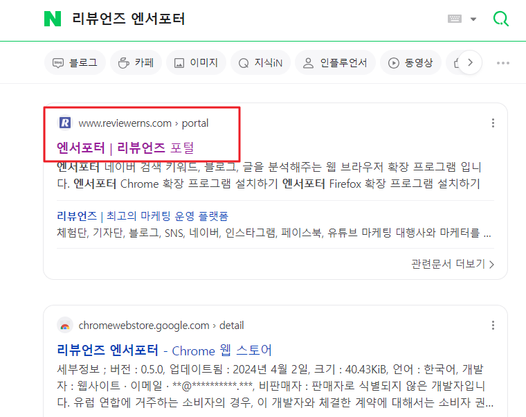 그럼 아래와 같이 리뷰언즈 엔서포터 검색결과가 나옵니다.