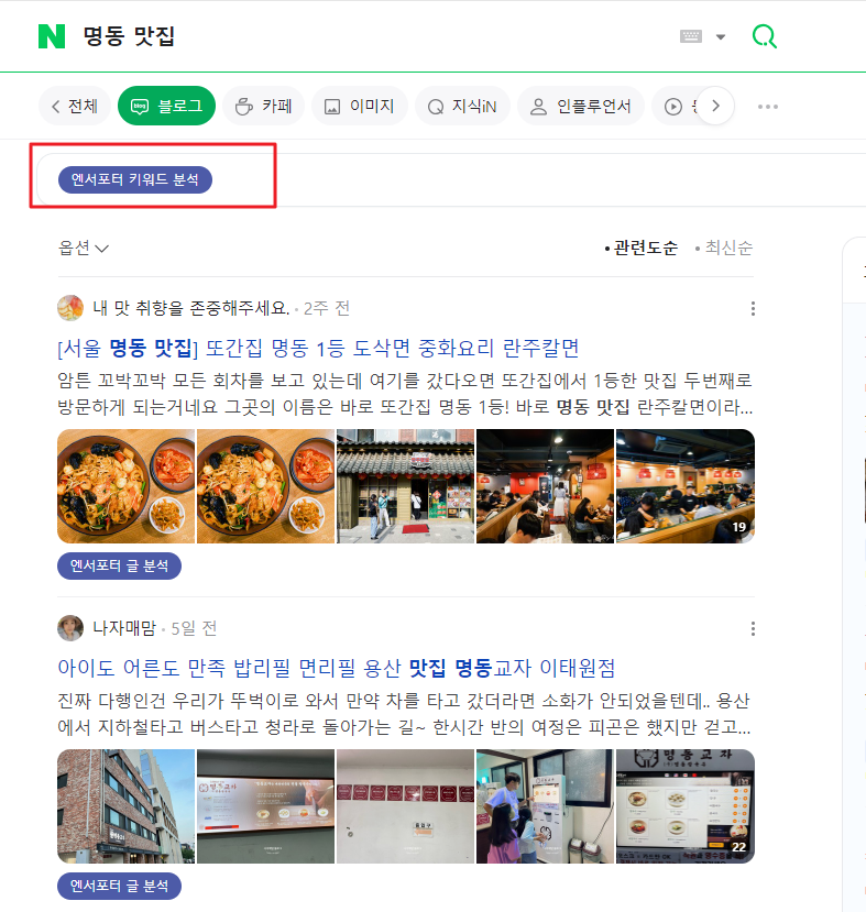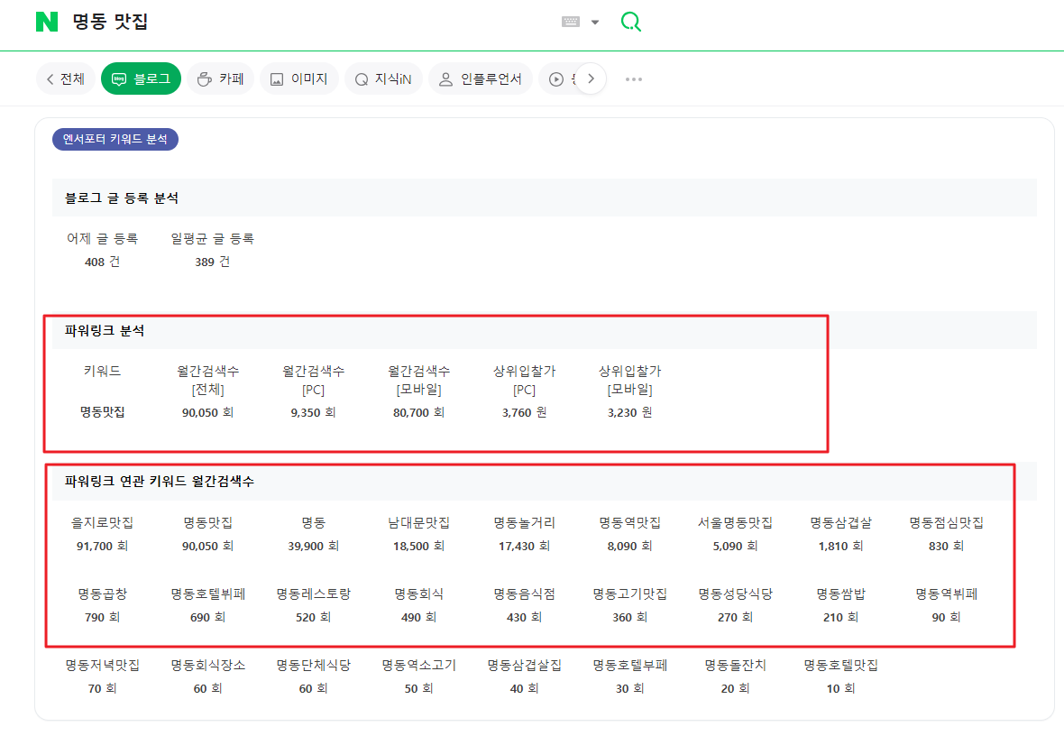 "명동 맛집"에 대한 키워드 분석도 해줍니다.