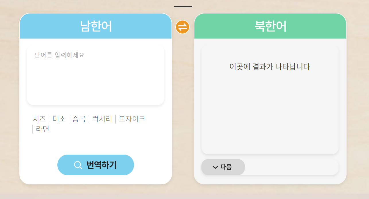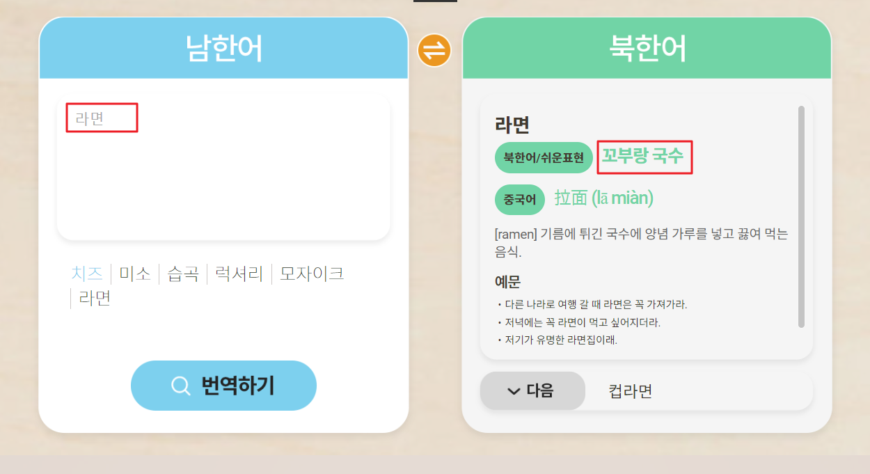 저는 네이버에서 북한말 번역기를 검색하여 아래와 같이 나왔습니다.