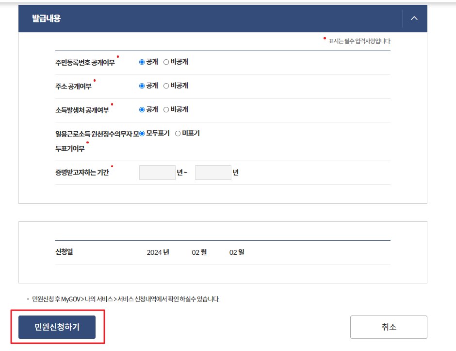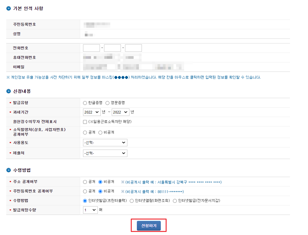 주민등록번호, 주소, 소득발생처 등 공개여부는 본인의 상황에 맞게 선택해 주세요