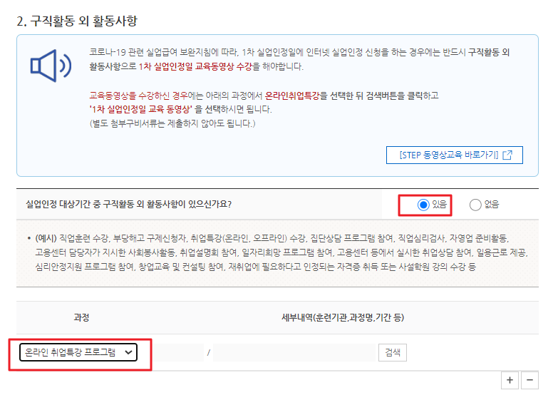 신청서 작성에서 유의해야 할 사항은 구직활동 외 활동사항에서 실업인정 대상 기간 중 구직활동 외 활동사항이 있으신가요? 질문에 "있음"으로 체크하고 과정중 온라인 취업특강 프로그램 선택 검색을 하시면 교육받으신 날짜가 자동으로 찍히게 됩니다.