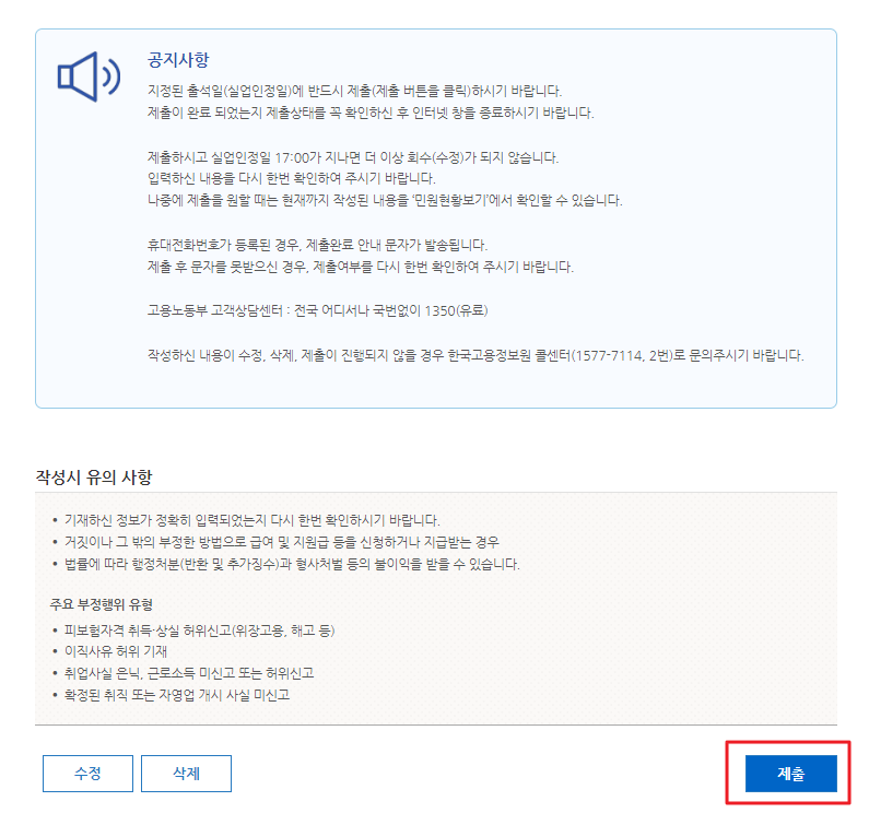 실업인정 신청서 제출은 본인의 실업인정일 당일만 오후 5시까지 가능합니다.