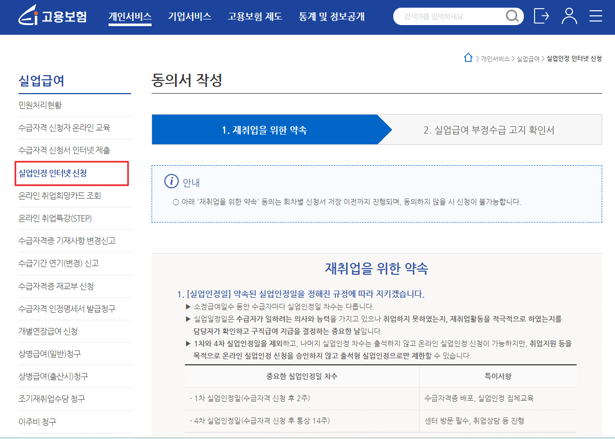 1차 실업인정일에 고용센터 출석을 희망하지 않으시는 분은 아래 경로에 따라 1차 실업인정 온라인 교육을 수강하고 인터넷으로 실업인정 신청서를 전송하시면 됩니다.
