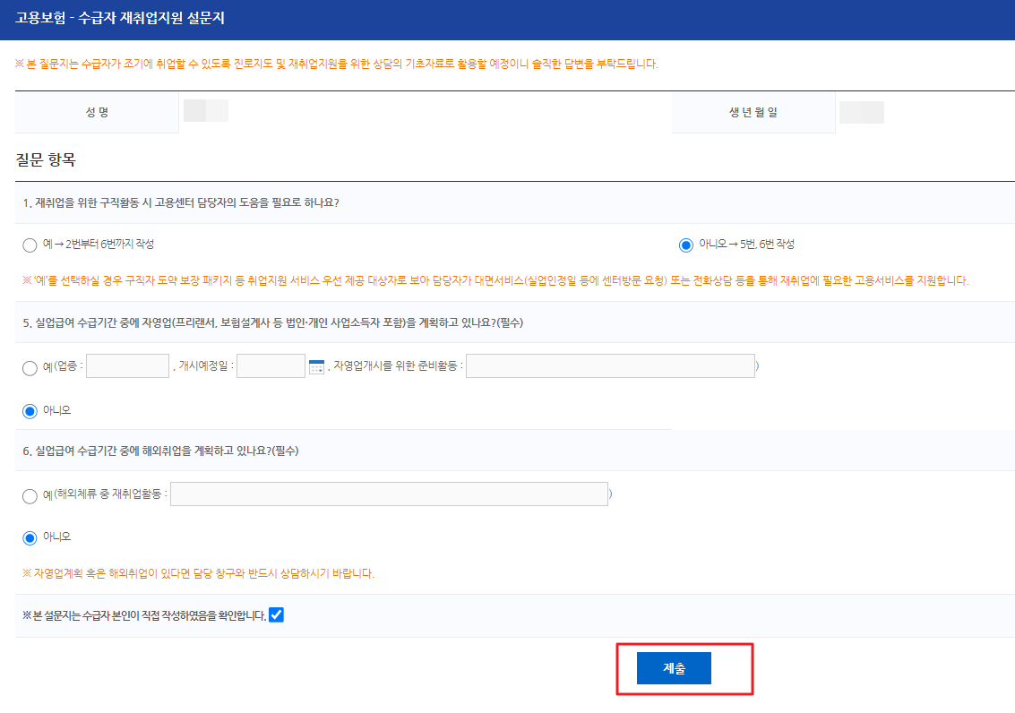 각 항목별 내용을 보시고 체크하시고 제출하시면 됩니다.