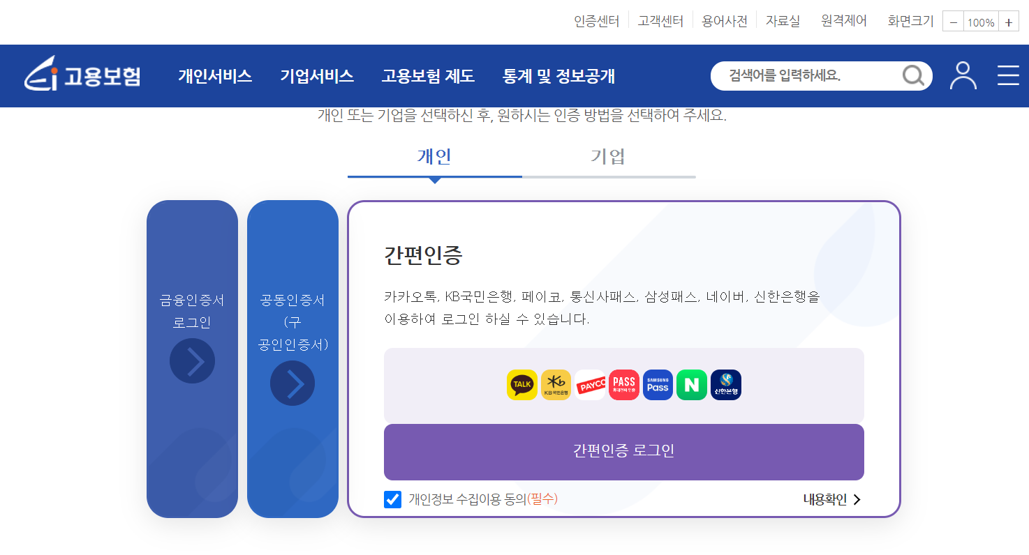 고용보험 홈페이지에서 로그인을 합니다.