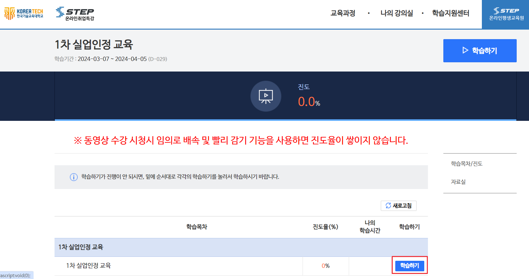 나의 강의실에 1차 실업인정 교육 학습하기를 클릭합니다.