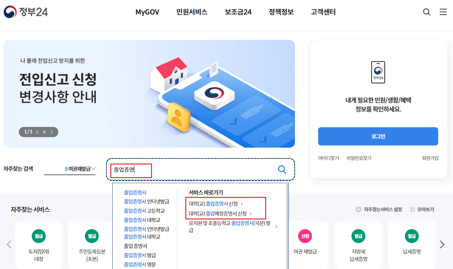 정부24홈페이지에서 검색창에 졸업증명서라고 검색합니다.