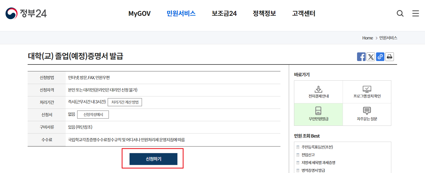 졸업증명서는 정부24홈페이지에서 신청가능합니다.