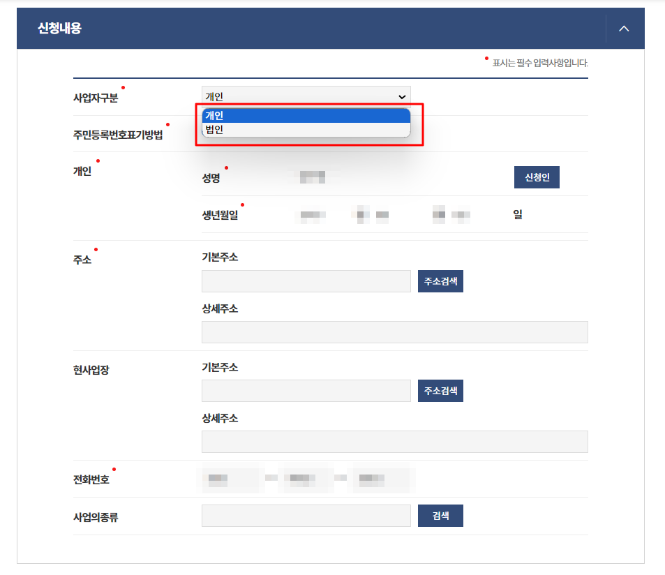 개인이거나 법인중에 본인의 상황에 맞게 선택해 주면 됩니다.