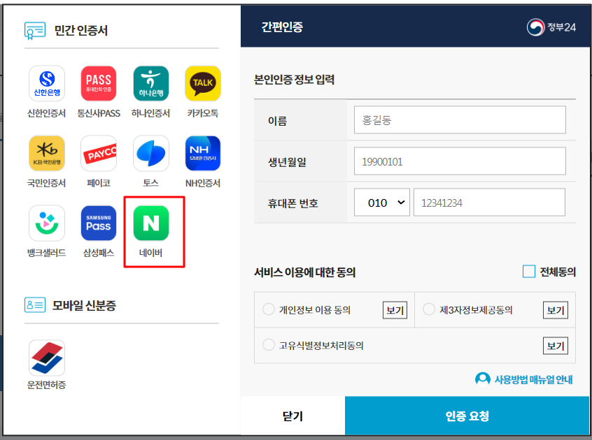 민간인증서중 네이버 인증을 이용하였습니다.