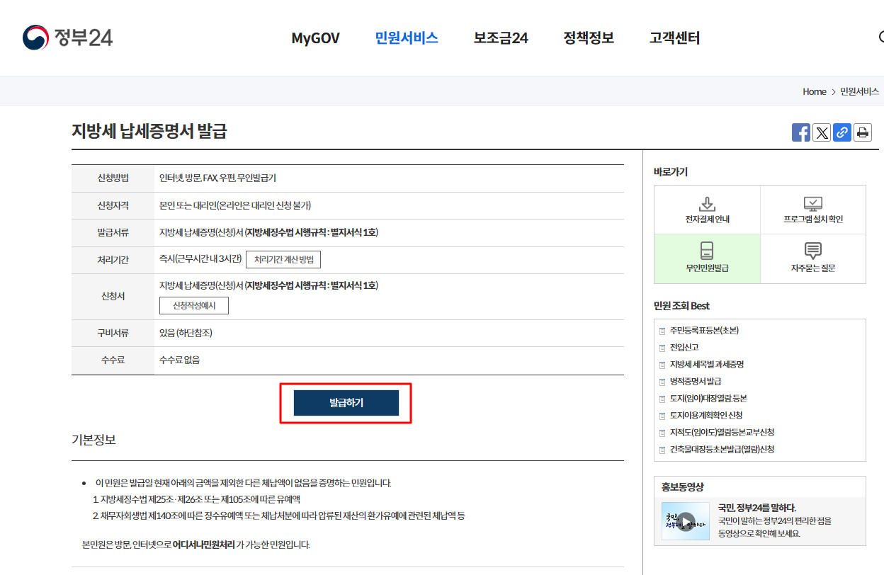 지방세 납세증명서 발급은 구비서류 열람 사전동의를 거치면 민원처리기관에서 행정정보 공동이용을 통해 확인하여 발급가능합니다.