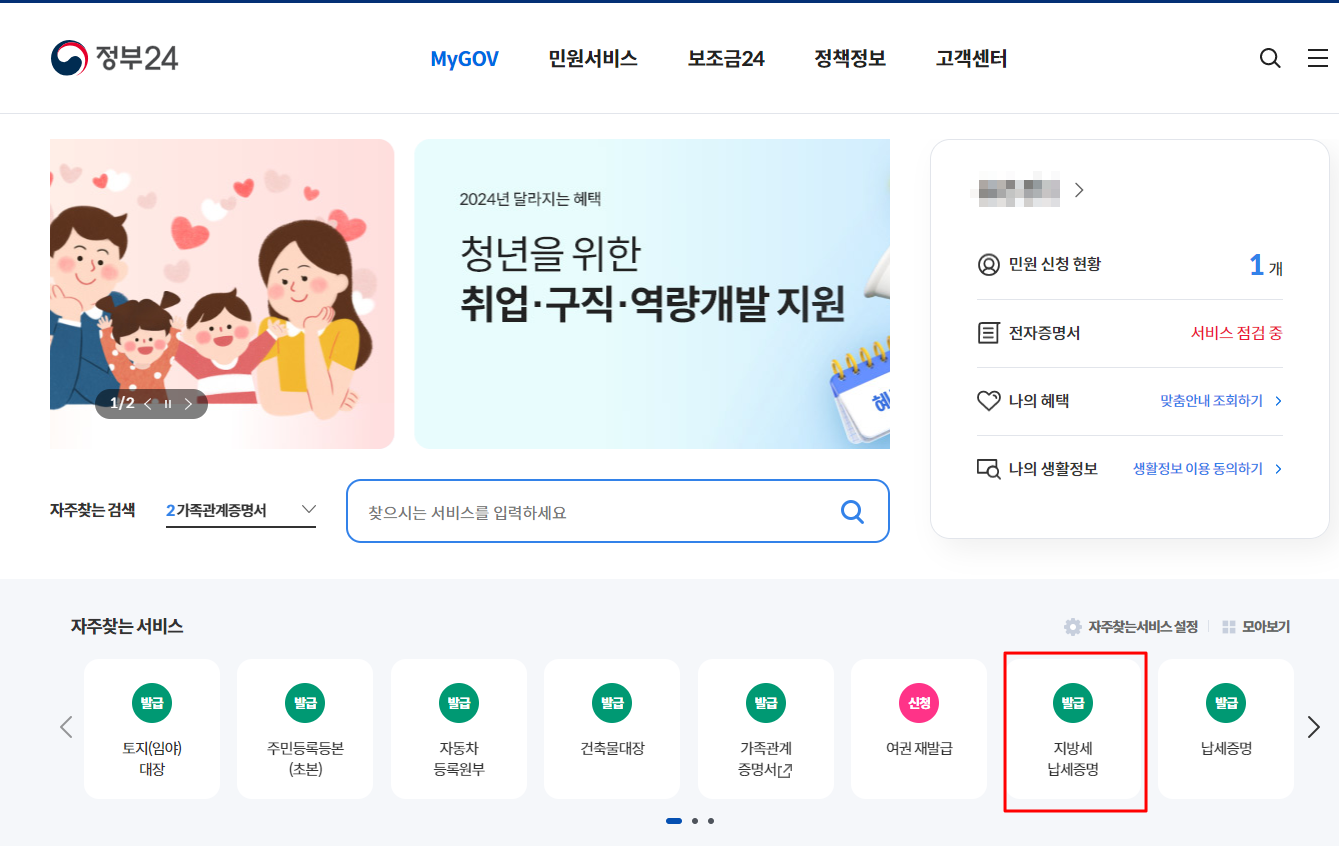 로그인 한 후 메인화면의 하단에 보면 지방세 납세증명이라고 보입니다.