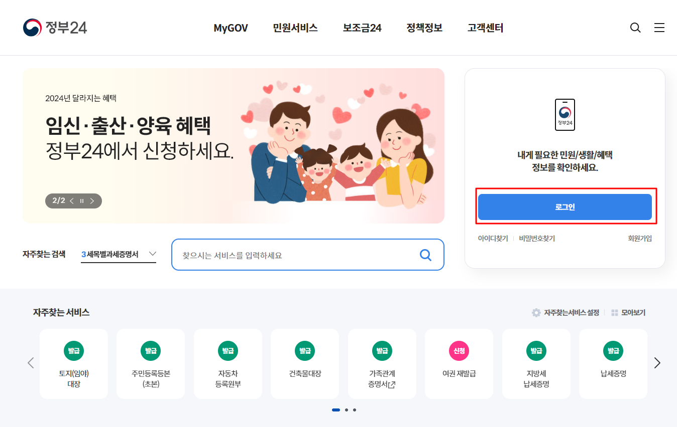 정부24사이트에서 로그인을 해줍니다.